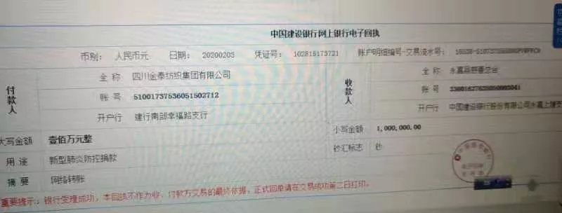 上午10時許,永嘉縣慈善總會收到了一筆特殊的網絡轉賬,記者在中國建設銀行網上銀行電子回折單上看到,付款人是四川金泰紡織集團有限公司,用途上寫著新型肺炎防控捐款,金額為一百萬元整。據(jù)永嘉縣慈善總會介紹,這筆捐款也是目前我縣收到的單筆最高捐款。